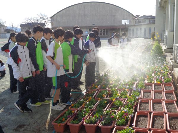 1月29日(木)に1年生が卒業式及び入学式の式場を装飾するための花の苗をプランターに植え付けてくれました。卒業式及び入学式まで、毎日水やりや花摘みなどを行い、心を込めて育ててくれると思います。