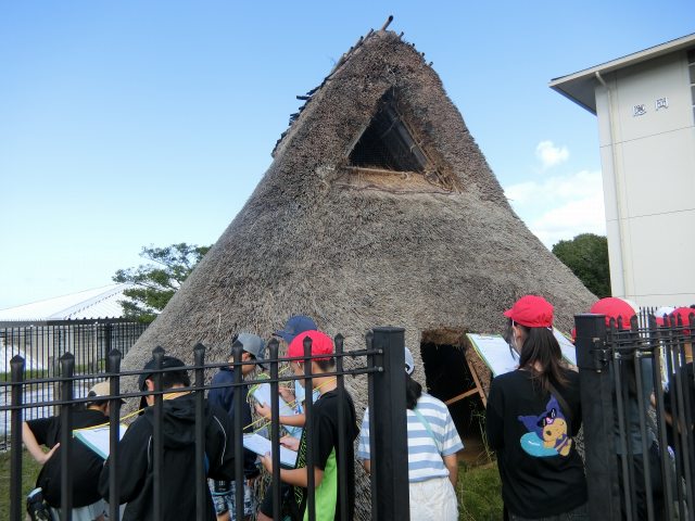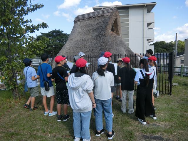 2025/09/30 隠岡遺跡公園の見学に行きました 9月30日(火)午後に6年生が隠岡遺跡公園(かくれがおかいせきこうえん)の見学に行きました。隠岡遺跡は伊勢市倭町にある、弥生時代後期から鎌倉時代の遺跡です。発掘調査によって弥生時代後期の竪穴住居45棟と平安時代の掘立柱建物13棟が見つかっています。当日は、伊勢市役所文化政策課の方に説明していただきました。公園内には復元竪穴式住居が1棟あり、内部に入って見学しました。子どもたちはメモとりながら、熱心に説明を聞き、質問していました。自分たちの住む地域の歴史に興味を持つきっかけになったと思います。 |