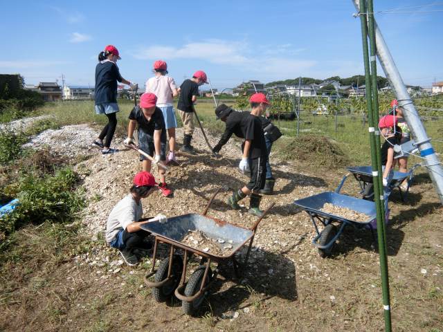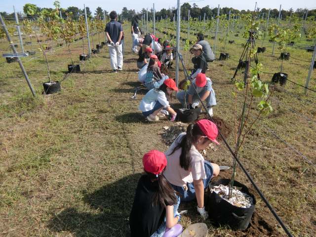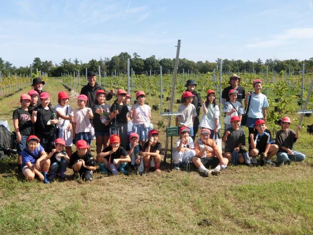 2025/10/02 ワインぶどう植樹体験を行いました 10月2日(木)午前にワインぶどう植樹体験をしました。伊勢市市制20周年記念事業「食体験プログラム」の一環として実施しました。4年生と5年生が、学校の北方にある伊勢志摩ワイナリー株式会社の畑地で体験しました。ぶどうの木を植えるグループと肥料となる牡蠣殻を運ぶグループに分かれて作業しました。子どもたちは、意欲的に取り組んでいました。貴重な体験をさせていただきました。お世話になった伊勢志摩ワイナリー株会社・伊勢市役所農林水産課の皆様方ありがとうございました。将来、今日、植樹したぶどうからつくられたワインを飲んでみたいと思います。 |