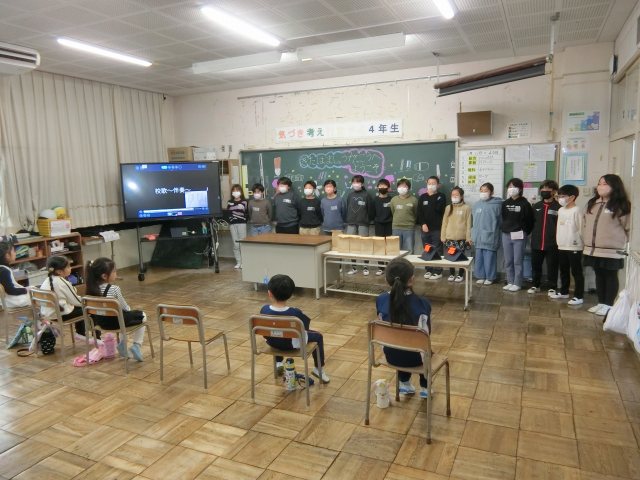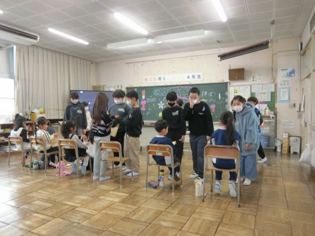 | 2026/02/25 有滝保育園と村松保育園の園児が小学校を訪問しました 2月25日(水)3限目に有滝保育園と村松保育園の年長さんが小学校を訪問しました。4年生が案内などを行いました。最初に校歌を歌って園児の皆さんを迎えました。その後、校舎を案内し、4年生教室で4年生が作成した学校に関する動画を見たり、ジェスチャーゲームをしたりして、交流しました。園児の皆さんには、小学校の様子について知ってもらえたと思います。また、校舎見学の時、園児の補助をするなど上級生としての姿が見られました。4年生の皆さんありがとうございました。 |