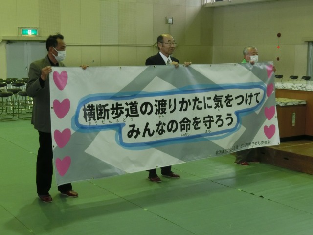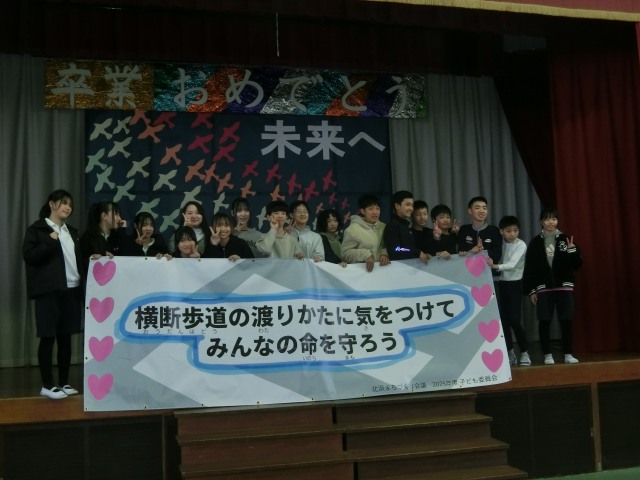 | 2026/03/03 横断幕のお披露目会を行いました。 3月3日(火)1限目に横断幕のお披露目会が実施されました。6年生が参加し。雨天のため体育館で行いました。横断幕は、子ども委員会の横断幕作成係が中心となり作りました。横断幕には「横断歩道の渡りかたに気をつけて みんなの命を守ろう」と記されています。子どもたちの交通安全に対する思いがあれわれています。ご協力いただいた北浜まちづくり会議の皆様、ありがとうございました。 |