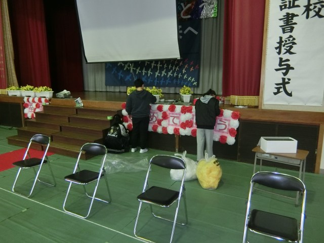 | 2026/03/18 明日は卒業式です 明日が卒業式となりました。今日の午後に5年生に手伝ってもらって卒業式の準備を行いました。在校生の皆さんは、卒業生の思い出となるように、呼びかけや歌を頑張ってください。また、卒業生の皆さんは、緊張するかもしれませんが、歌や呼びかけの練習の成果をいかしてください。明日の卒業式を楽しみにしています。 |