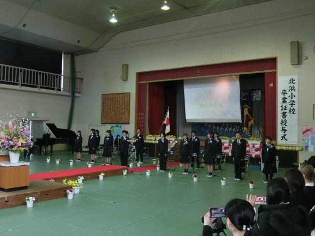| 2026/03/19 卒業式を行いました 3月19日(木)午前に卒業式を行いました。卒業生・在校生の呼びかけ・歌ともすばらしく感動しました。ありがとうございました。卒業生の皆さんは、北浜小学校の卒業生であることを誇りに、自信を持って、進んでいってください。中学校で、活躍することを、心から願っています。 |
