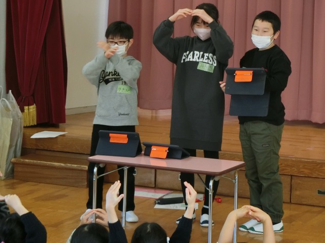 | 2026/01/14 村松保育園との交流を行いました 1月14日(水)の午前中に、4年生が村松保育園の園児と交流しました。11月に実施する予定でしたが、校内でインフルエンザが流行したため延期していました。交流は、総合的な学習の時間で、学んできたことを園児に伝えることによって、高学年の自覚を高めることを目的に実施しました。まず、火事の時の避難に関する紙芝居を行いました。その後、自分たちが学習した内容に関する〇×クイズなどをしました。最後に9つのブーズに分かれて、児童が考え・準備したゲームを園児が体験しました。園児と児童は、楽しそうに交流していました。ゲーム時には、スムーズに進むように、児童が園児に声を掛けていました。子どもたちの成長した姿が見ることができました。 |