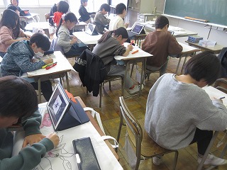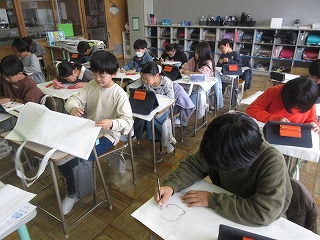 子どもたちの3学期の学校生活も、今日を入れて残り三日間となりました。朝から各学級ではそれぞれのまとめを進めていました。体育館でお楽しみの時間を持つ学級、まとめのテストを行う学級、残りのドリルやプリントを行う学級などと・・・。写真は、4年生2組の子どもたちが、この一年間に頑張って作った作品などを入れて持ち帰るための袋にデザインをしているところです。図工や書写、学級活動などを通して、ステキな思い出の作品がたくさんできましたね!