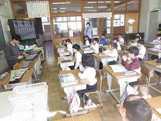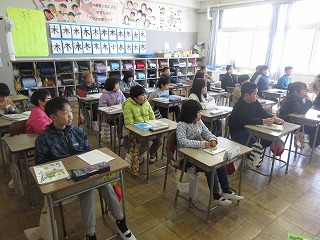 3年生の2限目は、1組が書写、2組は算数の時間でした。書写では、今年は午年ということで、子どもたちが「馬」という文字と絵に挑戦していました。絵では手本をよく見て、自分のアレンジも入れながらかわいい馬の絵をかいていました。算数は長さの勉強で、1mの二分の一が50センチであることを学んでいました。先生の説明をしっかり聞く姿がとても立派に見えました。