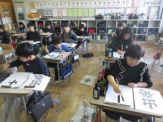 どの学年も、3学期の授業を順調に進めています。午前中、二つのクラスが毛筆を使った書写の授業を行っていました。3年2組は「元」という文字で、「はらい」と「はね」の筆の運びに注意して練習していました。文字を書く前には「姿勢と筆の持ち方に気をつけるように」という先生の言葉があり、子どもたちが集中して書いている姿はとても立派に見えました。4年1組は「出発」という二文字で、文字の大きさに気をつけて取り組んでいました。多くの子から「『発』が難しい」という言葉が聞かれましたが、どの子も手本をしっかり見て取り組んでいました。回数を重ねるごとに上達していく子どもたちです。