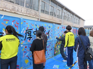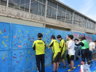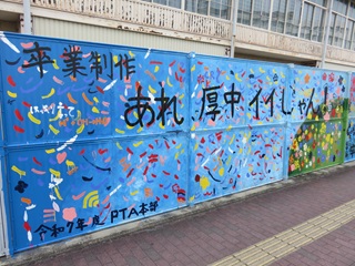 2月24日(火)、今年も、PTA本部の皆さんが中心になってフェンス事業を行っていただきました。この事業は、コロナ禍で様々な行事が中止になっていた4年前、子どもたちに少しでも記念の思い出を残してもらおうと当時のPTA本部の皆さんが始めた事業です。今年度は、3年生の生徒が発案したデザインが描かれました。3年生は、奉仕作業と並行してクラスごとにペンキでフェンスに模様を描きました。PTA本部役員の皆さん、本当にありがとうございました。