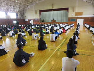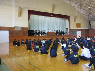 立候補した9名の生徒とその応援者は、1・2年生の生徒の前で、しっかりと自分の考えを述べていました。来年度も、これまで同様に、みんなで「考え」、そして「役割を果し」、すごしやすい学校を創ってほしいと思います。