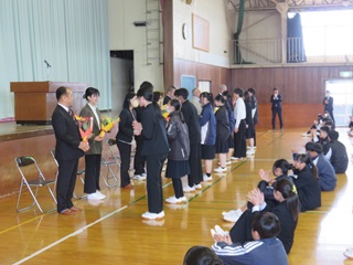 離任式では、本校を離任する10名の教職員が紹介され、一人ひとり挨拶をした後、生徒から花束が贈られました。また、12時からは、PTAでも送別の会を開いていただきました。本部役員の皆さま、ありがとうございました。