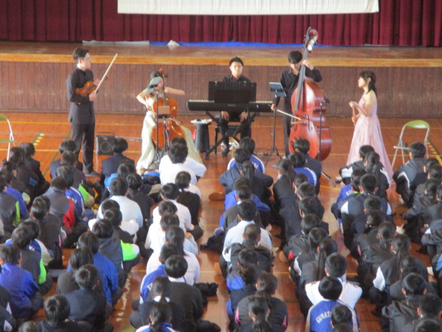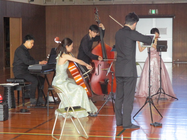 Minichestraの皆さんが来校され、素晴らしい演奏を披露してくださいました。バイオリン、フルート、チェロ、コントラバス、ピアノの5つの楽器で編成された、校区内外で活躍する若手実力派のグループです。生徒たちになじみのある楽曲も交えながら、約40分間にわたり演奏していただきました。