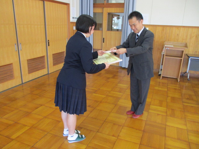 12月16日(火)2限後の休み時間を利用して、全校を代表して福祉委員長さんが表彰状と記念品を受け取りました。