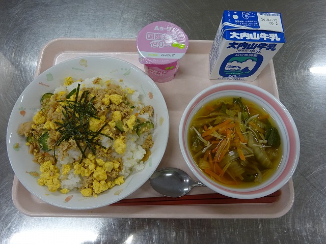 今日の給食は、「ちらしずし、牛乳、菜の花のすまし汁、ももゼリー」でした。