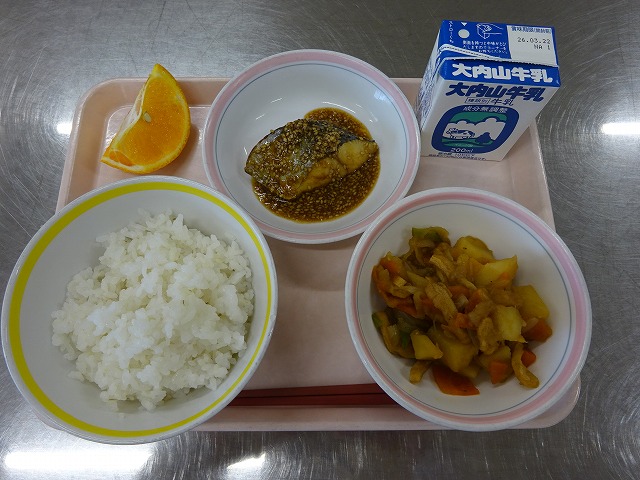 今日の給食は、「麦ごはん、牛乳、鰆のごまゴマ焼き、じゃがいもの煮物、デコポン」でした。