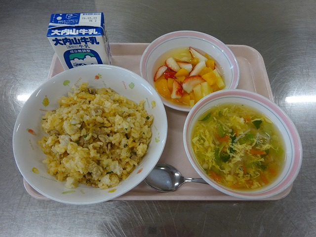 今日の給食は、「キムチチャーハン、牛乳、卵スープ、いちご入りフルーツポンチ」でした。