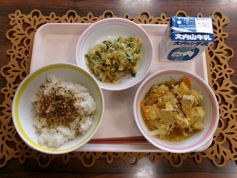 今日の給食は、「わかめごはん、牛乳、鶏のからあげ、添え白菜、けんちん汁」でした。