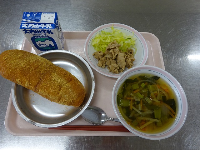 今日の給食は、「きなこ揚げパン、牛乳、豚肉のワイン煮、添えキャベツ、野菜スープ」でした。
