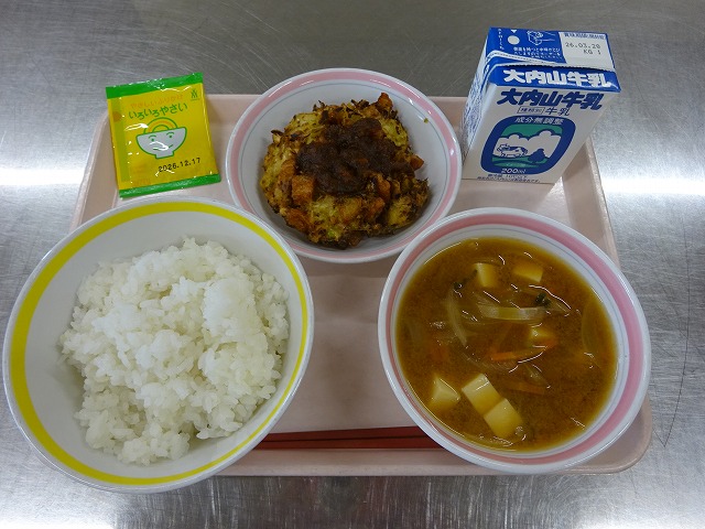 今日の給食は、「麦ごはん、牛乳、けいちゃん、和風ポテトサラダ」でした。