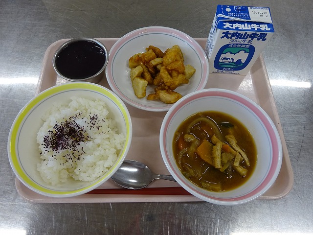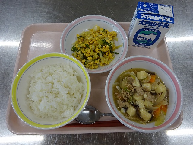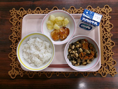 今日の給食は、「麦ごはん、牛乳、豆腐の中華煮、卵とチンゲン菜のサラダ」でした。 今日の中華煮には「きくらげ」が入っていました。きくらげは給食ではあまり使われない食材です。「木なのかな?くらげなのかな?」と聞いてみると、「きのこです!」と答えてくれたクラスが多かったです。きくらげの写真を見せると、「おどっているように見える」といている子もいました。確かに、おどっているようみ見えるのできくらげというのかもしれませんね。「家でもよく食べるよ!「家の人が3個パックで買ってくるよ!」「ラーメンに入っているよ」という声もありました。コリコリした食感がよかったです。 |