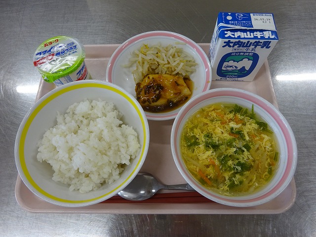 今日の給食は、「麦ごはん、牛乳、鶏のねぎソースかけ、もやしのひたし、お祝いかきたま汁、ファイバーヨーグルト」でした。