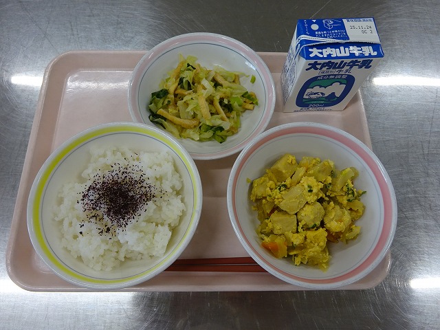 今日の給食は、「中華飯、牛乳、わかめスープ、大学芋」でした。
