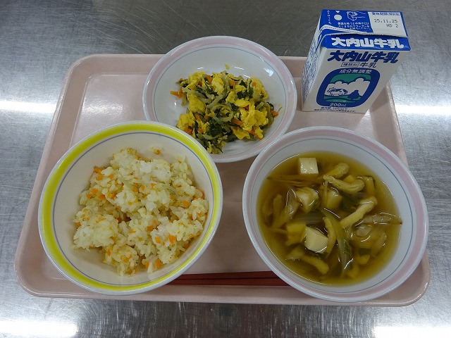 今日の給食は、「にんじゃごはん、牛乳、卵と野菜の炒め物、ごぼうのみずなの汁物」でした。
