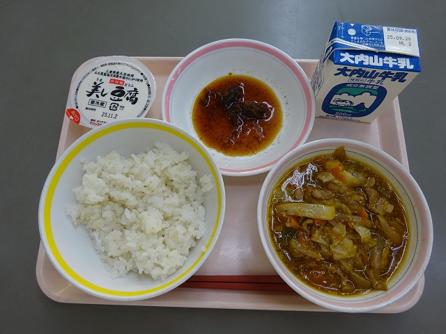 今日の給食は、「麦ごはん、牛乳、ひややっこ、キャベツと豚肉のごまみそ炒め」でした。