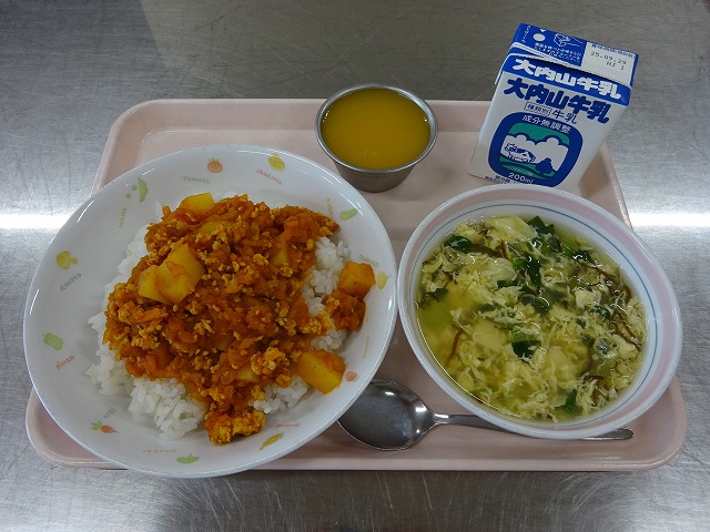 今日の給食は、「タコライス、牛乳、もずく入り卵スープ、手作り五ケ所産みかんゼリー」でした。