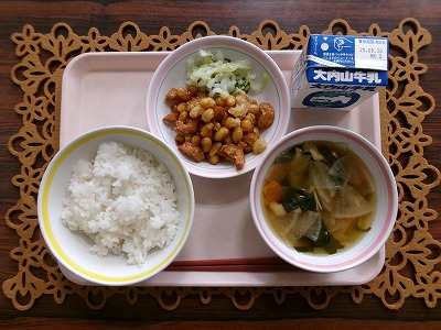 今日の給食は、「麦ごはん、牛乳、ちくわと大豆のレモンあげ、そえ白菜、すまし汁」でした。