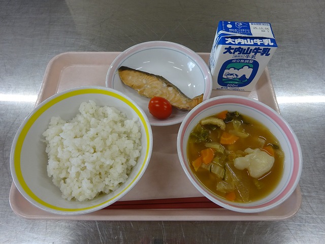 今日の給食は、「麦ごはん、牛乳、鮭の塩焼き、ミニトマト、すいとん」でした。