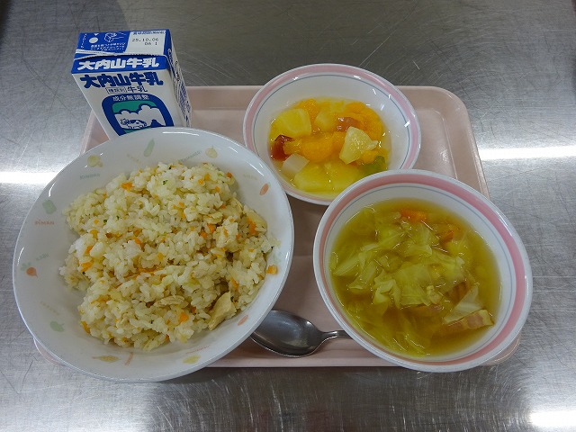 今日の給食は、「チキンピラフ、牛乳、豆と野菜のカレースープ、カクテルポンチ」でした。