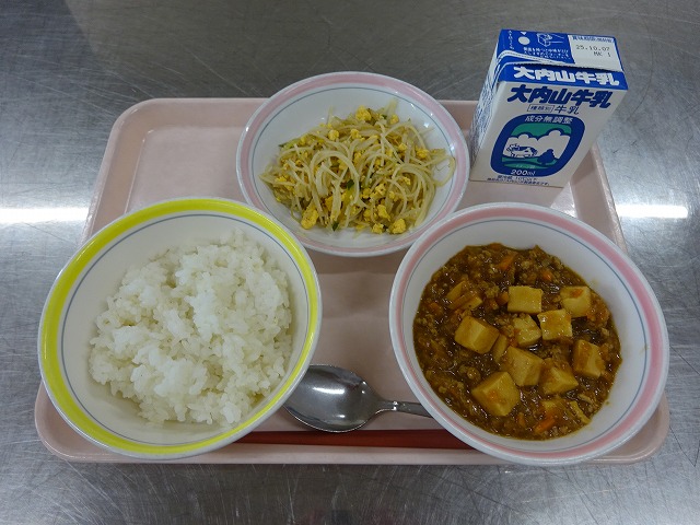 今日の給食は、「麦ごはん、牛乳、マーボー豆腐、ビーフンの中華サラダ」でした。