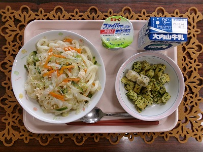 今日の給食は、「サラダうどん、牛乳、高野豆腐とじゃがいもの青のり揚げ、ファイバーヨーグルト」でした。