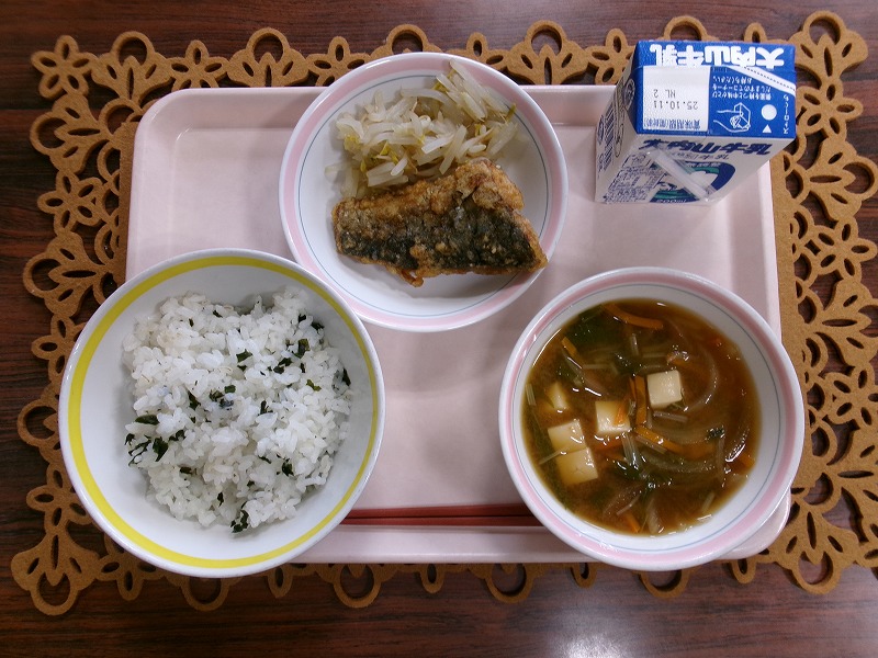 今日の給食は、「わかめごはん、牛乳、さわらのあげに、もやしのひたし、みそしる」でした。