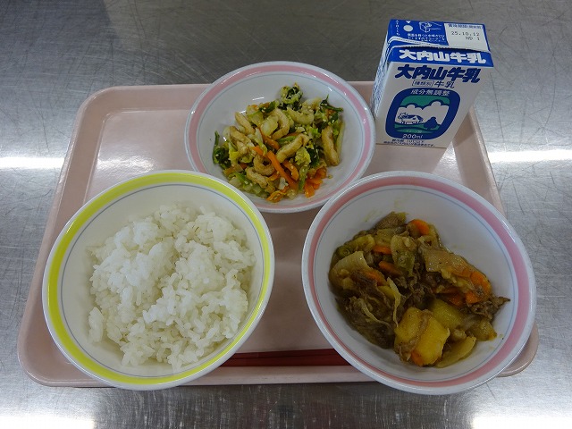 今日の給食は、「麦ごはん、牛乳、肉じゃが、ごまあえ」でした。