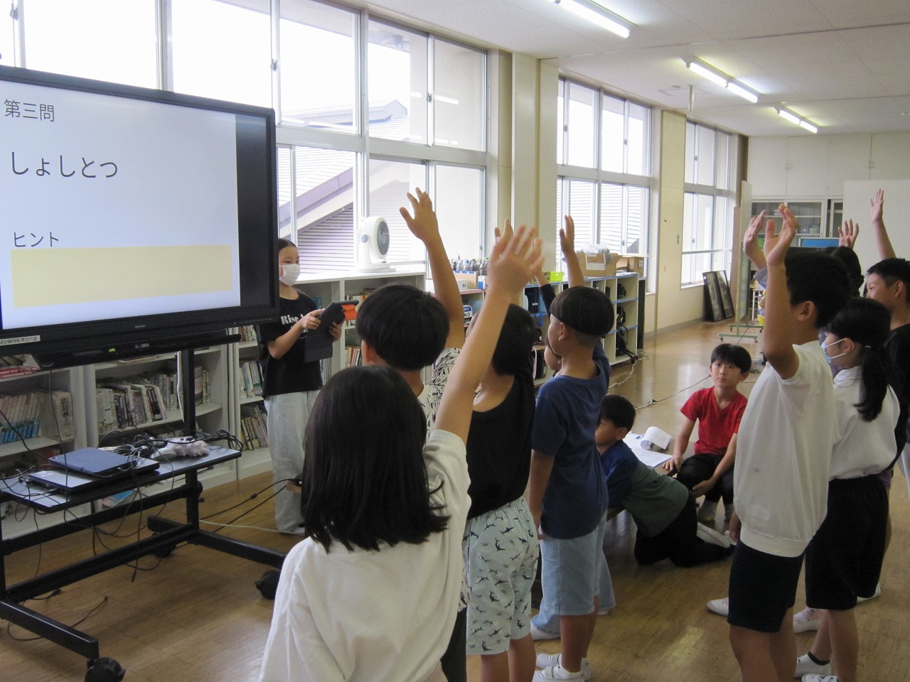 本日、縦割り班集会をしました。全校児童が16の班に分かれ、12のミッションに取り組みました。高学年のみなさんが 低学年のみなさんを助けてくれていました。写真は「キャラクター穴埋めクイズ」「ひらがなならべかえクイズ」「たし算ゲーム」です。運営委員のみなさん、よくがんばってくれました。みんなは楽しめたと思います。