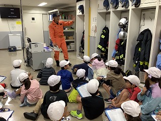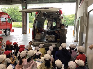 また、消防車や救急車などを間近で見せてもらいました。ていねいに説明していただき、子どもたちは消防のしくみや役割について学習を深めることができました。
