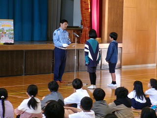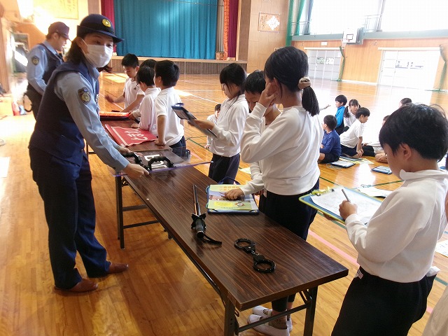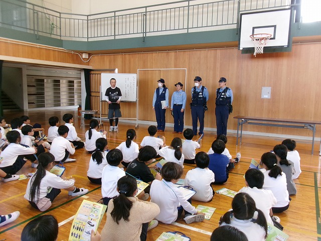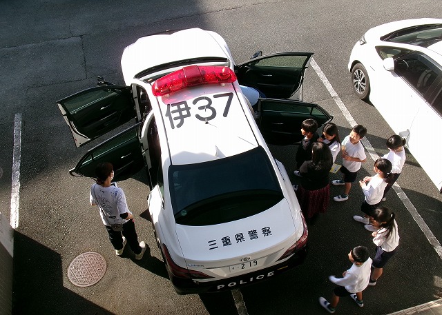 市内の警察官(伊勢警察署および曽禰町交番)の方々に来ていただき、3年生が「警察のおしごと出前授業」を受けました。刑事部や交通部、生活安全部など仕事を分担していることや110番センターのしくみなどを教えていただきました。