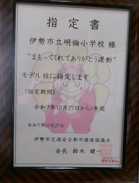 伊勢警察や市の交通政策課の方に来ていただき、「まもってくれてありがとう運動」のモデル校指定式が行われました。