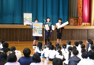 この運動は、横断歩道を渡るときに止まってくれている運転手さんに、「ありがとう」を言ったり、頭をさげたりしてお礼の気持ちを表すことで、歩行者も運転者も交通安全意識を高めることを目的としています。式では児童会の代表児童が「交通安全宣言」を読み上げてくれました。