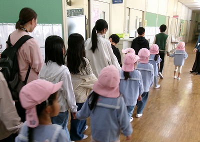 マリアこども園のらいおん組(年長)の子どもたちが明倫小に来てくれて、5年生と交流しました。校舎内を案内して、図書室で絵本の読み聞かせをしたり、体育館でレクをしたりして楽しみました。後日、おとなりのめいりんこども園の年長さんたちも来る予定があります。