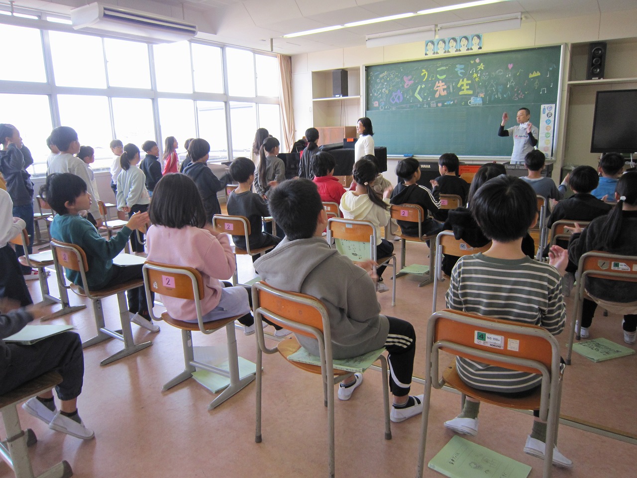 市の健康福祉部の方に来ていただき、4年生が「キッズサポーター養成講座」の授業を受けました。ゲストティーチャーとして、校区にお住いの鈴木さん(目の不自由な方)に来ていただき、色々な話を聞かせていただきました。「障がい」のあるなしにかかわらず、困っている人がいたら、声をかけたり自分にできることをしたりすることが大切だと学びました。