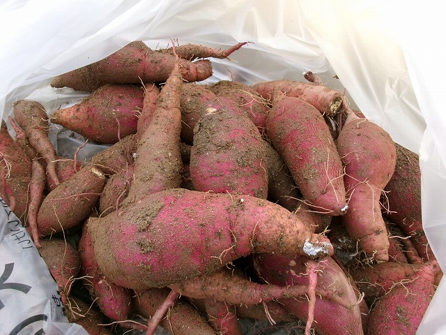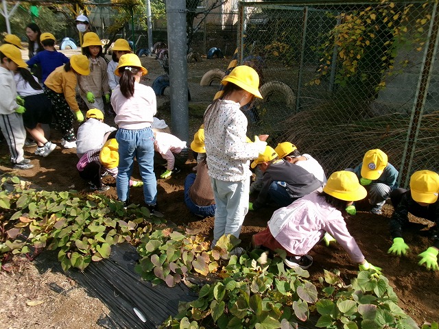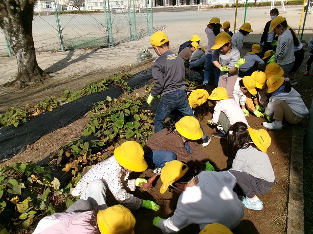 1年生が学級園でいもほりをしました。5月に植えたサツマイモです。みんなで力を合わせて、大きいイモや細長いイモ、丸っこいイモなどたくさん掘ることができました。
