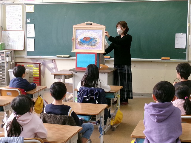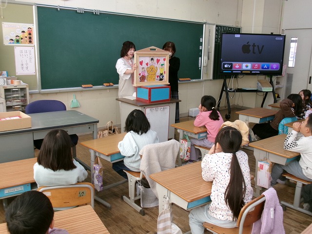 保護犬・保護猫の活動をされている荒木さんと三橋さんに来ていただき、1,2年生へ「あったま〜るところ」という紙芝居をしてもらいました。色んな事情で飼い主がいなくなった犬や猫がいることや譲渡会(じょうとかい)で新しい飼い主が見つかること、ペットを飼う場合は愛情と責任を持って飼ったほうがいいことなどを学ぶことができました。内容は、ほんわかして心が「あったま〜る」ストーリーでした。