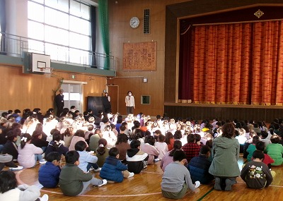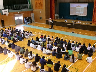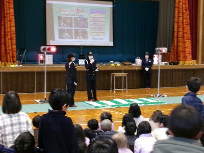伊勢警察署の交通安全指導員さんに来ていただき、体育館で交通安全教室をおこないました。2限目は1〜3年生、そして3限目は4〜6年生でした。