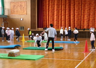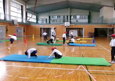 相好体操クラブのコーチに来ていただき、3年生が体操教室の授業を受けました。準備体操から始まり、前転や後転、側転などのコツを教えてもらい練習しました。ロイター板で坂を作ったり、跳び箱の1段目を使ったり、色々な工夫があって子どもたちは楽しそうに取り組んでいました。