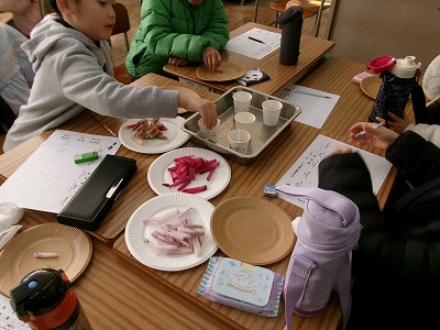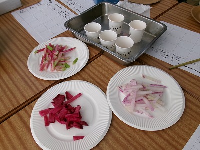 2年生が学級園で育てて収穫した3種類のだいこん(紅心大根、紅くるり、京むらさき)の試食をしました。それぞれに味がちがい、また用意した5種類のドレッシングとの相性もあり、子どもたちは味わいながら食べ比べていました。