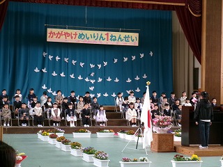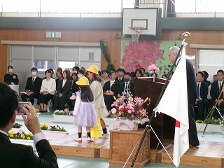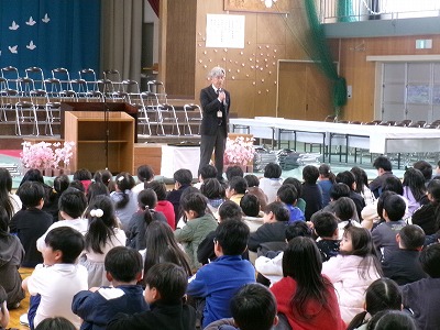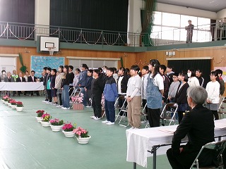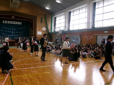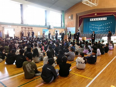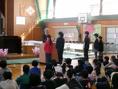 また修了式に引き続き、離任式を行いました。この3月末で明倫小学校を去られる教職員からお言葉をいただき、代表の児童が花束を渡して感謝の気持ちを伝えました。