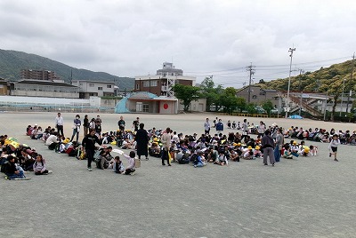 今年度、最初の避難訓練をしました。まず地震を想定し、揺れがおさまってから運動場に避難する訓練です。そして、津波警報が発令されたという設定で、校舎の3階に移動(2次避難)する練習もしました。