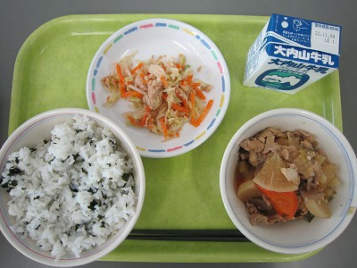 わかめごはん,牛乳,大根と豚肉の煮物,和風ツナサラダ